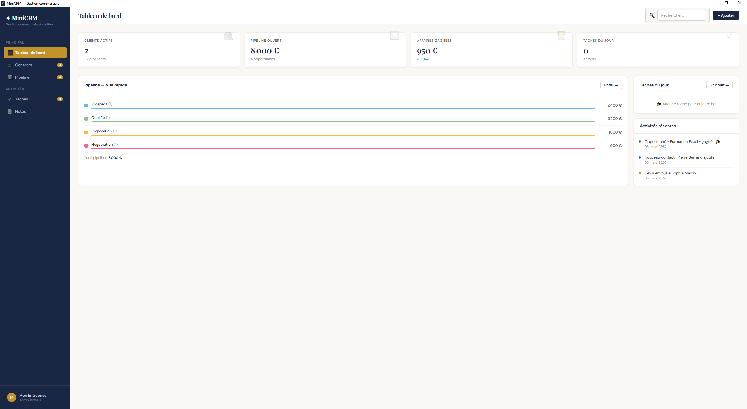 - Tableau de bord avec indicateurs clés : clients actifs, pipeline ouvert, affaires gagnées, tâches du jour.